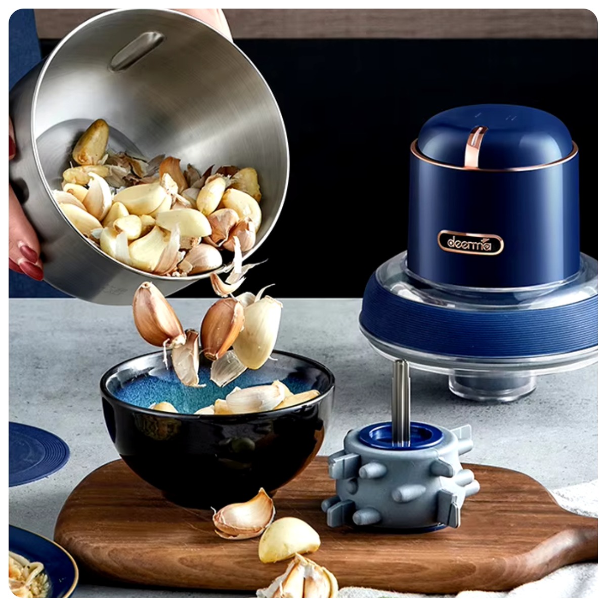 Устройство представляет собой компактную кухонную машину с автономным питанием, которая сочетает в себе функции мясорубки, измельчителя овощей, устройства по чистке чеснока от шелухи и взбивателя яиц.